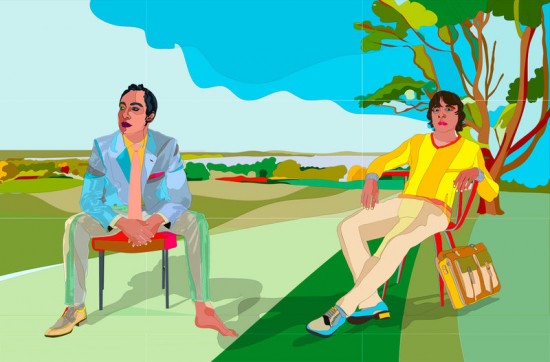 “Grass” ossia erba. Raffigura due donne, una accanto all’altra, una in piedi, una sdraiata sull’erba di un prato. Si direbbe che la ragazza in piedi abbia avvertito lo sguardo dell’altra ragazza, ma non reagisce, non la guarda. No. Composta nel suo vestito a strisce bianche e rosse, rimane del tutto ferma. Come sia arrivata lì questa ragazza non si capisce. È un’amica, sono due amiche? Forse. In “Grass” mi sembra di cogliere qualcosa di naturale e sfuggente insieme. Mi piacciono i colori e quando lo riguardo mi fa sorridere.