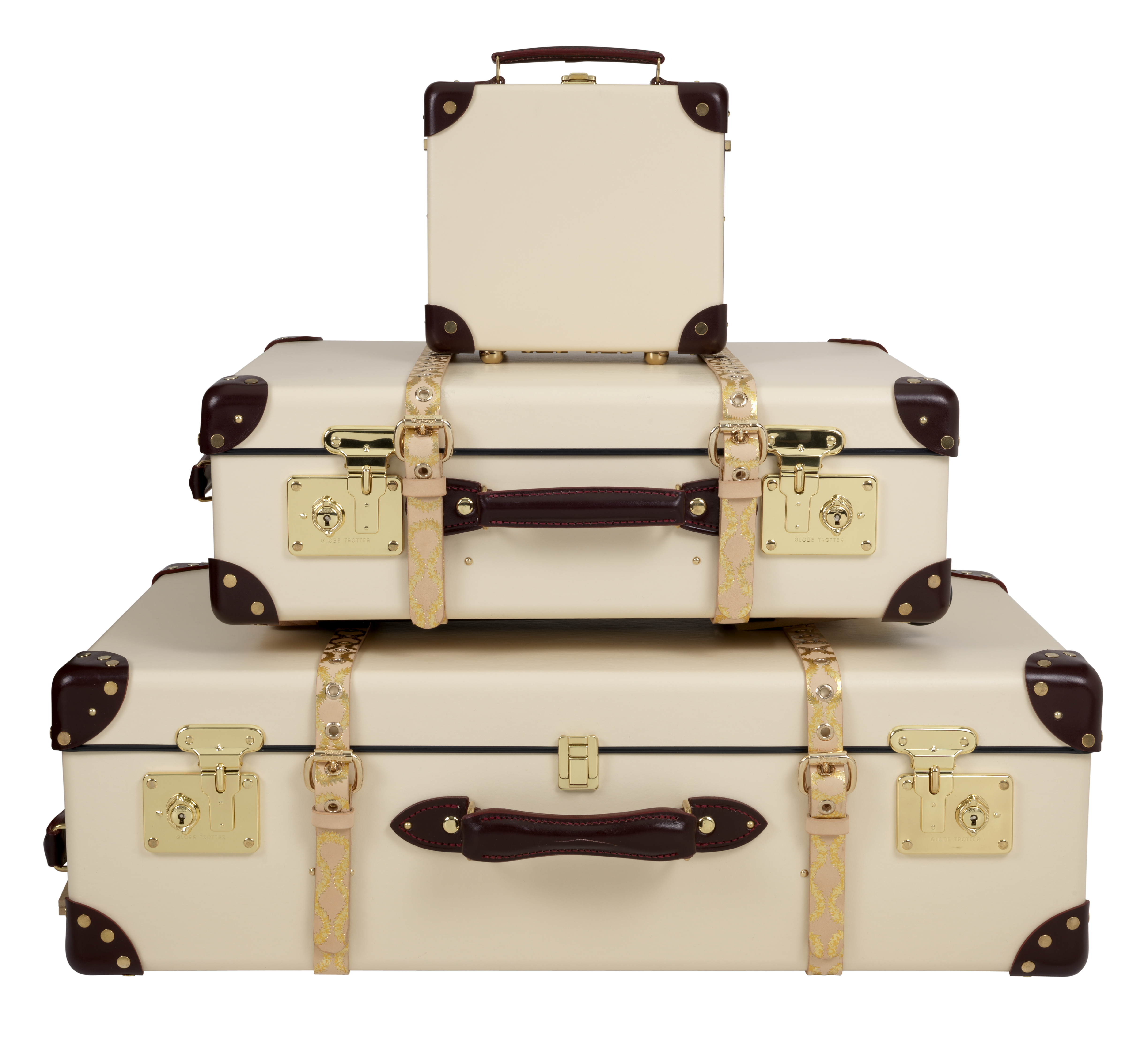 Punto forte di questa collezione sono le lussuose valigie Globe-Trotter, realizzate con angoli in pelle bordeaux e rifiniture in ottone lucido, disponibili in due colori: in crema e in blu notte, con interni foderati in tessuto tartan rosso e blu, segno distintivo della Maison Vivienne Westwood.