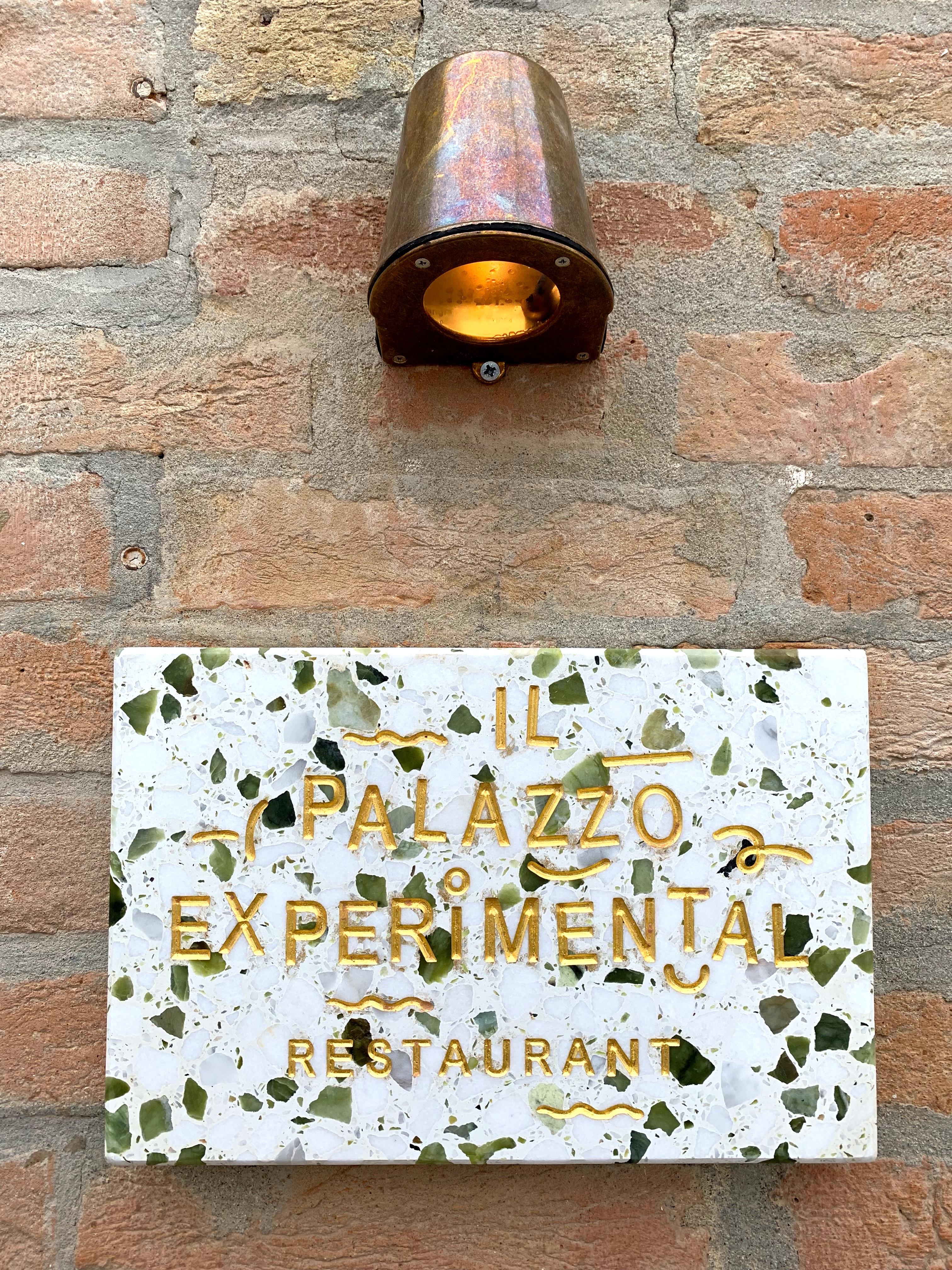 Esco e, nel vedere l’insegna, sorrido, perfetta sintesi delle numerose e raffinate citazioni incontrate all’interno: un’infantile scritta dorata su una piastrella di un moderno marmorino, bianco come la luce, verde come la laguna.