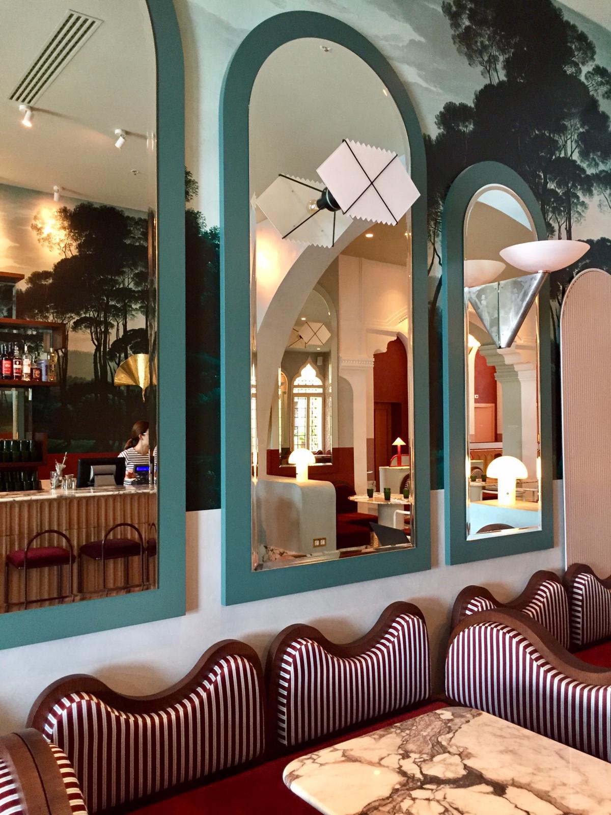 La sensazione favolistica è aumentata dai dettagli, che continuamente affiorano, rendono ogni visuale unica: le linee curve, della struttura delle sedute, delle cornici, degli oblò sulla cucina, delle lampade sferiche dalla superficie cromata e base in ottone, da un lato rimandano alla teoria di William Hogart nel suo saggio filosofico The Analysis of Beauty del 1753, manifesto del gusto rocaille, per cui la forma serpentina è la sola che suscita l’incanto della bellezza, in cui l’osservatore può perdersi ed inebriarsi, che evoca il senso della vivacità, del movimento, in un’allegra armonia sensoriale; dall’altro guardano alle forme pure reinventate da Ettore Sottsass, fondatore del movimento Memphis, per cui l’uso di geometrie, quali la sfera e il cilindro, e di colori sgargianti, hanno reso il kitsch parte della storia del design dagli anni ’80 ad oggi. L’elegante pulizia degli ampi spazi, le linee audaci ma semplici, l’uso del laminato plastico, che qui ritroviamo nelle strutture curve delle sedute, le textures colorate, riproposte nel pavimento quadrettato bianco e nero, sono tutti elementi atti a generare ottimismo. I canapés rivestiti di tessuto a righe in onore delle maglie dei gondolieri e il velluto bordeaux degli sgabelli del bancone bar, i bicchieri di vetro verde come i tappeti color della laguna, coniugano gli elementi della storia di Venezia con l’innovazione del décor francese, in un sottile ed elegantissimo gioco post-moderno di gusto – poco velatamente – retrò.