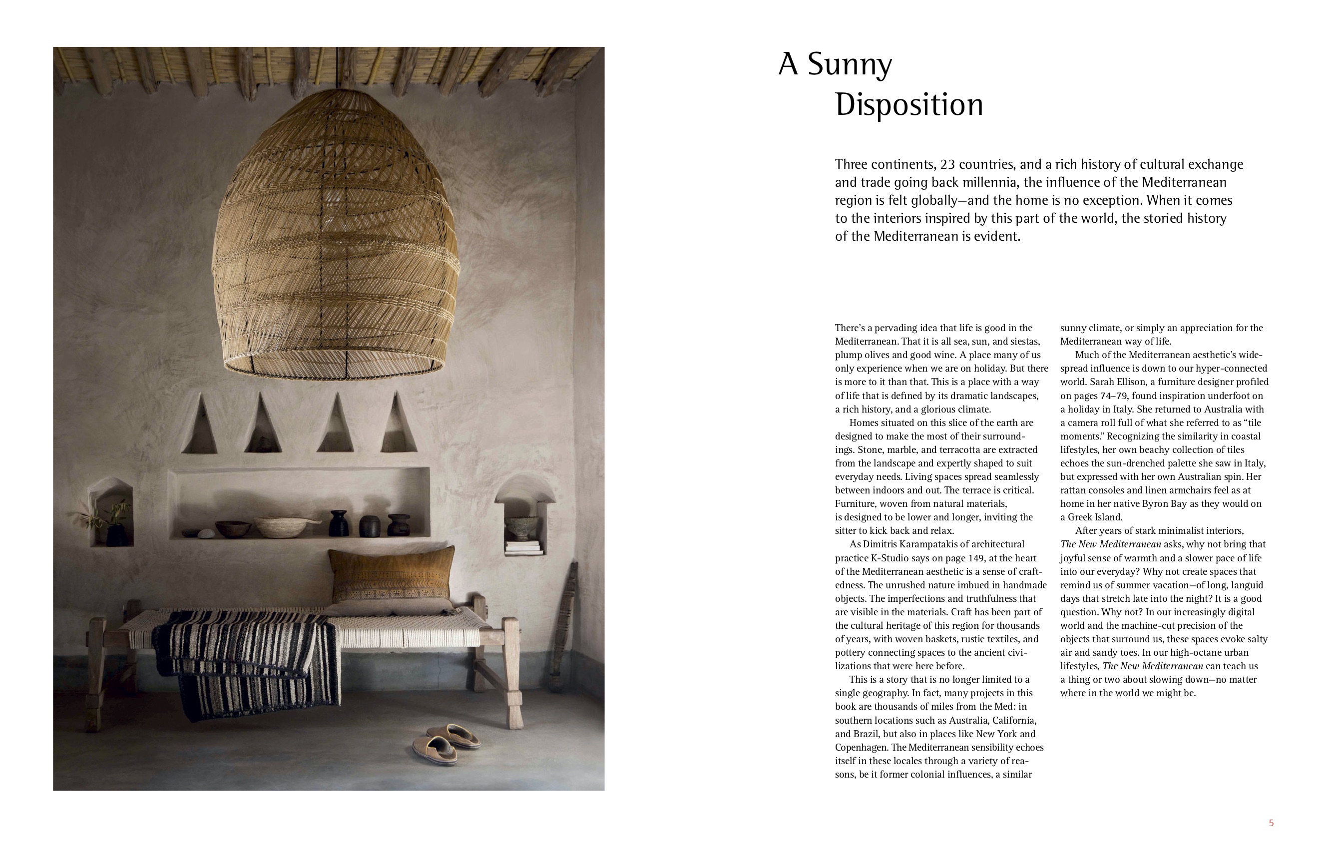 The New Mediterranean – Homes and Interiors sotto il sole del Sud del mondo, con le sue residenze e case vacanza delle quali vi innamorerete , anche grazie a tessuti colorati, ceramiche, mobili in rattan e tappeti berberi che si contrappongono a pareti imbiancate a calce, cemento, mattoni, mattonelle in terracotta e vetro. Il libro presenta i designer, gli architetti e i marchi che stanno dando vita allo stile, delineando gli elementi chiave per mostrare come creare questo look in casa. Più che una tendenza del design, è una filosofia per trasformare gli interni in oasi di luce, artigianalità e semplicità.
