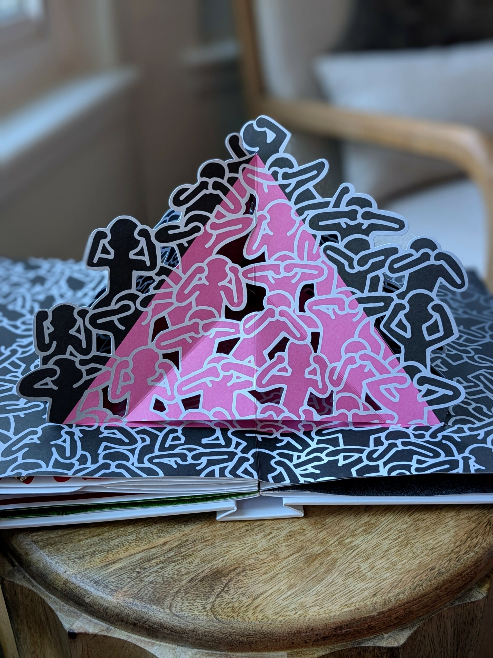 Ogni pagina del libro è il frutto di un lungo processo di progettazione, in cui Simon ha combinato movimento e creatività per rendere le opere “vive” in formato pop-up. Per esempio, ha trasformato il Pink Triangle in una piramide che simboleggia il peso e la gravità del simbolo, conferendo profondità al messaggio di Haring. Questo formato non solo rende omaggio al lavoro dell’artista, ma invita gli spettatori a interagire con esso in modo nuovo.