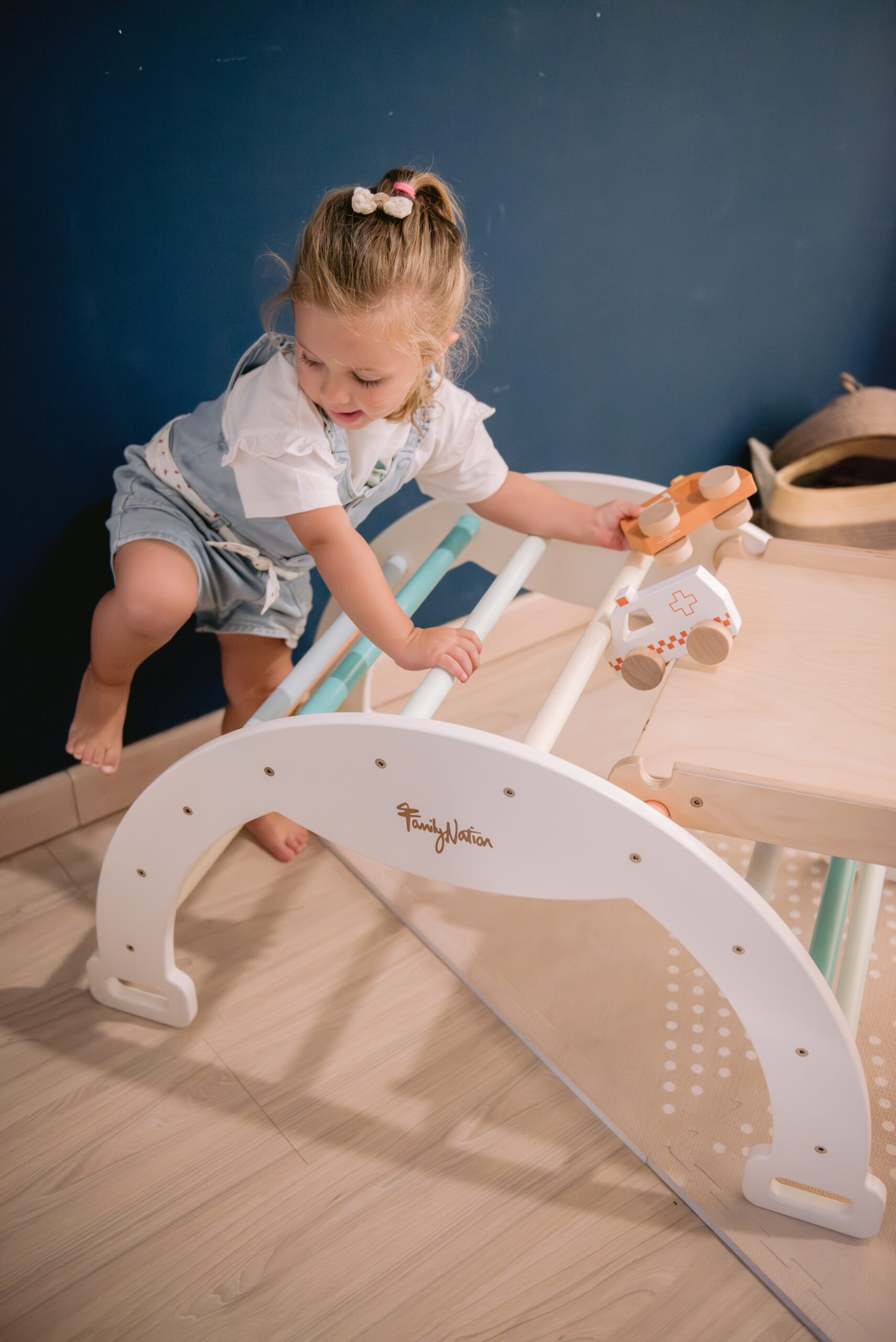 Family Nation propone una gamma di prodotti che stimolano la creatività e l’autonomia, garantendo al tempo stesso sicurezza e qualità. Tra i must-have troviamo l’Arco Montessori Rainbow 2 in 1, che si trasforma da dondolo ad arco per arrampicarsi, favorendo l’equilibrio e le capacità motorie sin dai 12 mesi. Questo versatile strumento aiuta i bambini a esplorare le loro abilità motorie in modo sicuro e divertente, accompagnandoli in diverse fasi della crescita. Completabile con il cuscino imbottito in cotone, offre massimo comfort durante il gioco e momenti di relax.