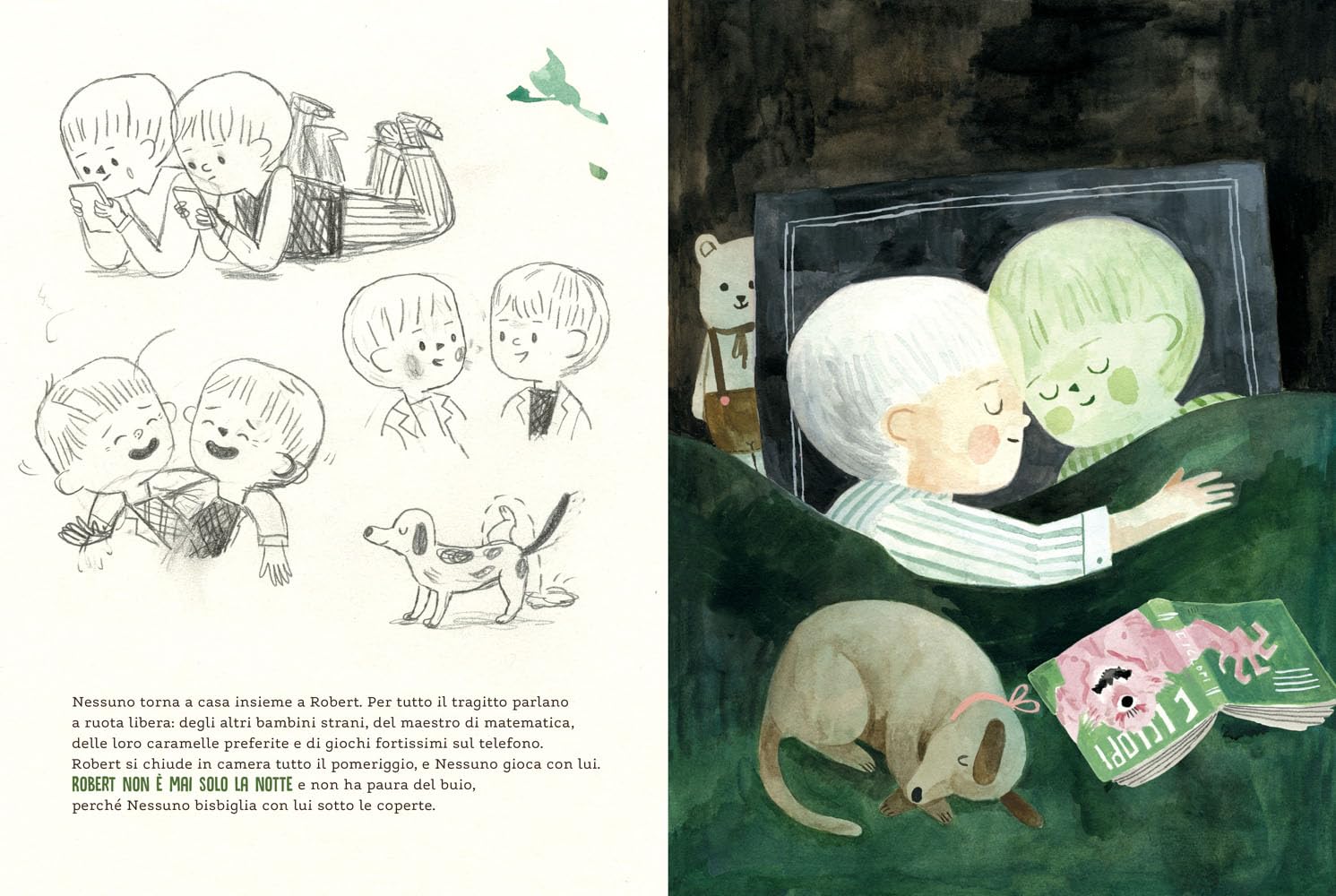 Con le parole di Kim Fupz Aakeson e le immagini di Anna Margrethe Kjærgaard, questo albo tocca il tema dell’amicizia immaginaria e della gelosia tra coetanei. Il protagonista ha un amico segreto, Nessuno, con cui condivide ogni cosa, finché arriva un nuovo bambino che mette tutto in discussione. Un albo malinconico e toccante, capace di rispecchiare le emozioni più intime dei piccoli.