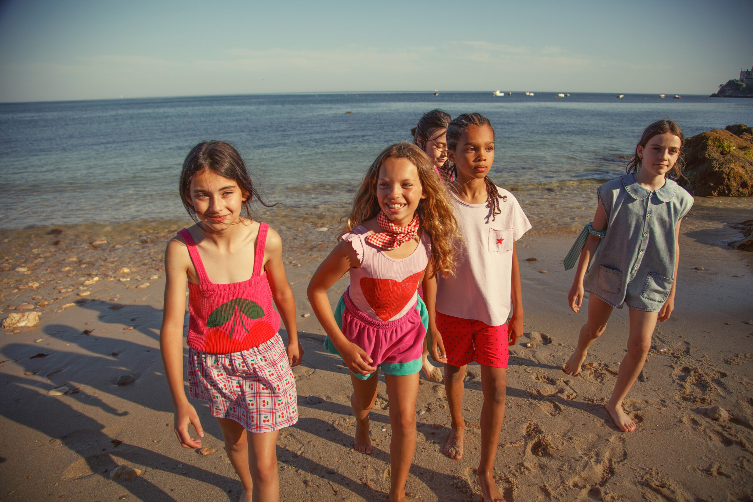 Il guardaroba SS26 si muove in questa dimensione narrativa, accompagnando il corpo e il movimento senza costringerli. I capi sembrano pensati per essere vissuti: per correre, sedersi a terra, costruire rifugi improvvisati, collezionare conchiglie e fotografie fatte con la colla glitterata. Ogni look racconta un momento che non sapeva di essere destinato a restare.